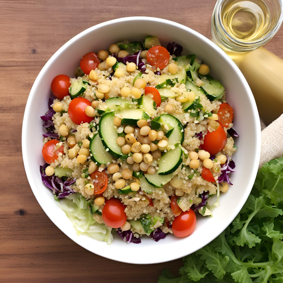 Quinoa, 4 leaf salad, cabbage, tomatoes, chickpeas, and cucumber topped with pumpkin seeds and dressed with wine vinegar and extra virgin olive oil.